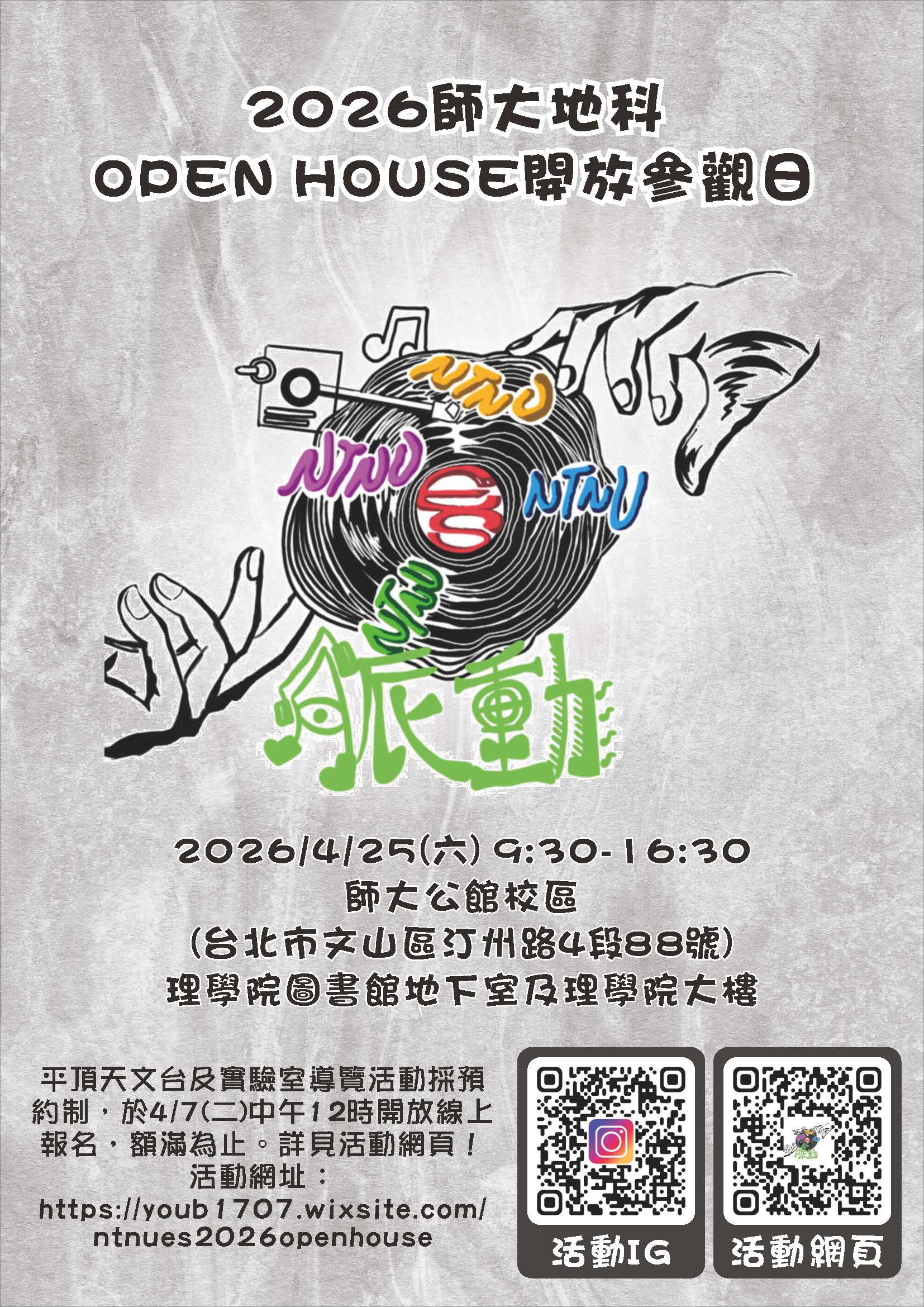 一、為推廣地球科學教育並引發學生對自然科學之學習興趣, 本校地球科學系特辦理「2026師大地科開放參觀日」,結 合互動體驗、實境解謎與研究展示,提供一場兼具知識性 與趣味性的學習活動。