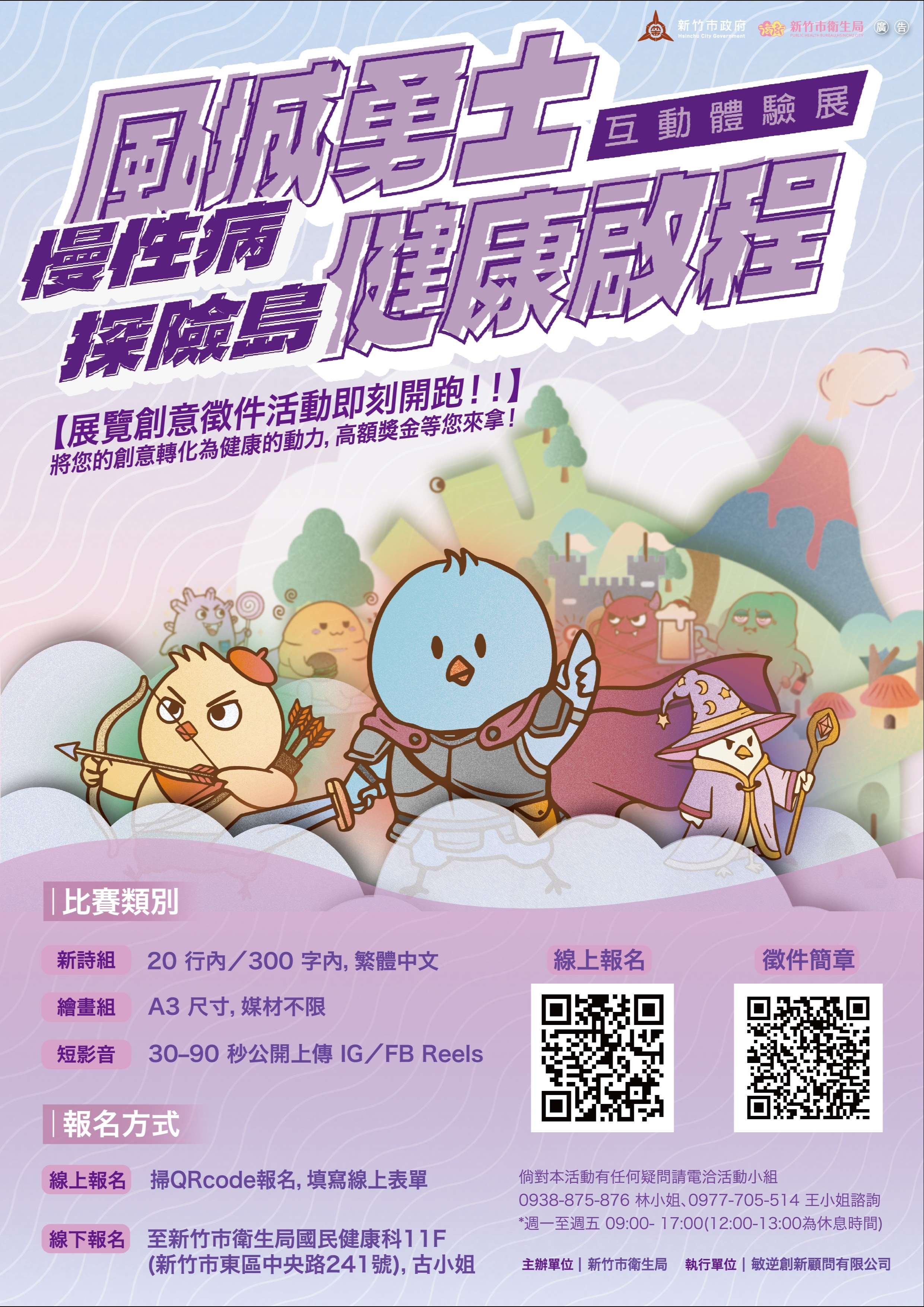 二、本局為提倡慢性病預防之重要性,特別辦理「『風城勇士健康啟程』慢性病探險島:互動體驗展」作品徵件活動。透過新詩、繪畫與短影音之創意徵件,鼓勵民眾發揮創意與直觀的圖文能量,將專業衛教知識轉化為具備社會感染力之藝術作品。本活動期待藉由不同形式的創作,使參與者在過程中建立正確的健康觀念,並將其落實於日常生活中,另本次將得獎作品將於展覽中展示。