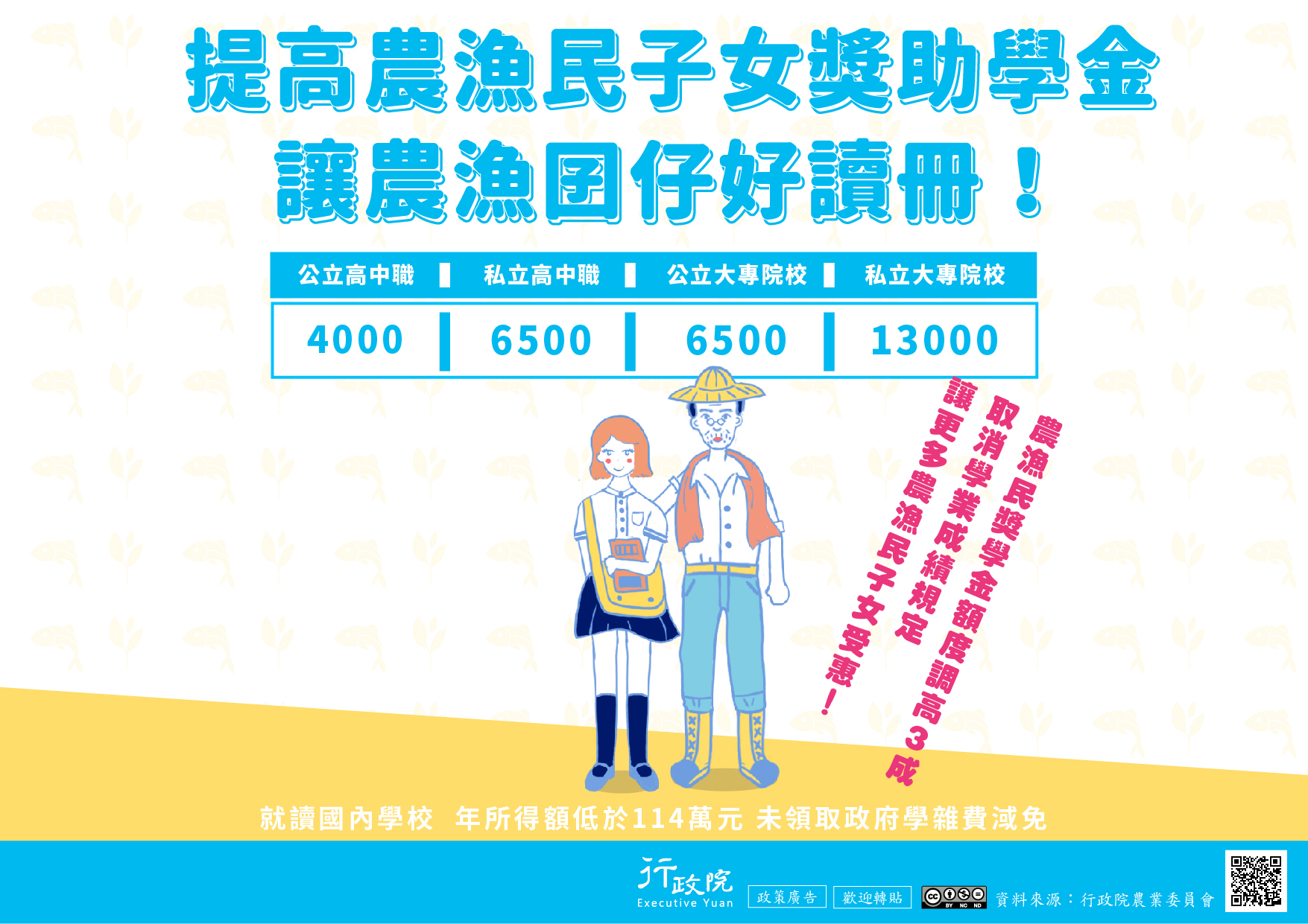 二、為貫徹照顧清寒及弱勢族群學生施政理念,政府修訂「農漁民子女就學獎助學金申請作業要點」,提高獎助學金額度,讓更多農漁民子女受惠。