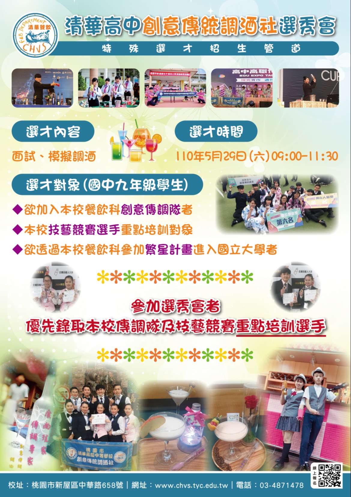 二、檢送本校「餐飲科創意傳統調酒社選秀會文宣(如附件)」,請貴校協助公告並鼓勵國中九年級學生踴躍報名。二、選才日期:05月29日